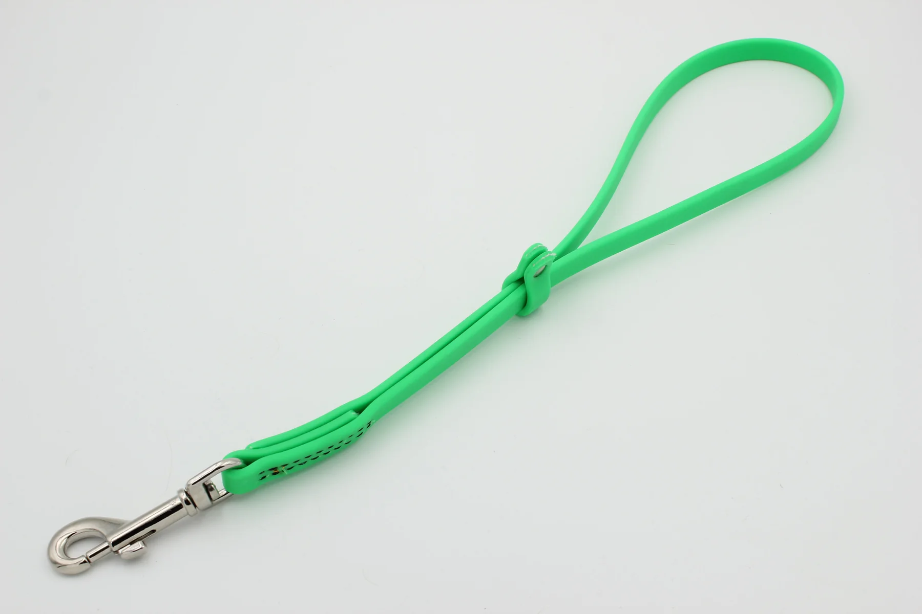Our BioThane Grooming Tub Tie Out w/Stainless Steel Snap are made from official BioThane which is made in the USA. BioThane has a polyester webbing coated in rubber-like PVC. Even the narrowest options has a strength limit of 750 pounds so no worries about it breaking with use. It is waterproof and non-porous so it is very easy to clean and sanitize. It won’t mildew or stink no matter how often you use it. It will not cause hot spots or damage coat as long as used correctly. Many groomers use it from tub to table due to the uniqueness and quick dry properties.
