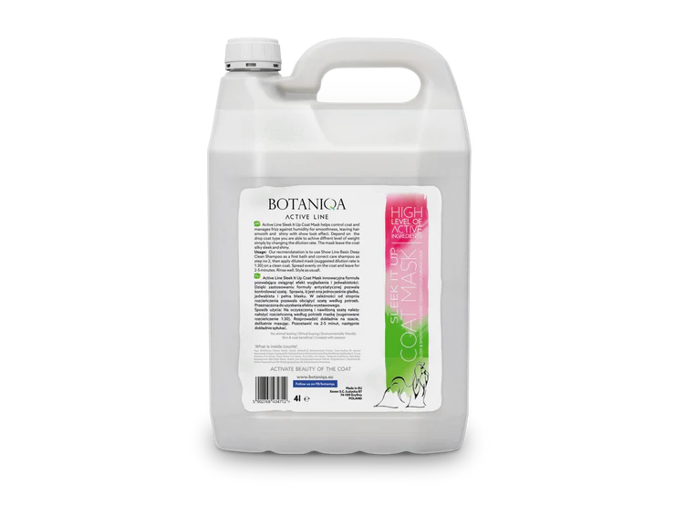 Active Line Sleek It Up Coat Mask helps control coat and manages frizz against humidity for smoothness, leaving hair smooth and shiny with show look effect. Depend from the drop coat type you are able to achieve different level of weight simply by changing the dilution rate. The mask leave the coat silky sleek and shiny.