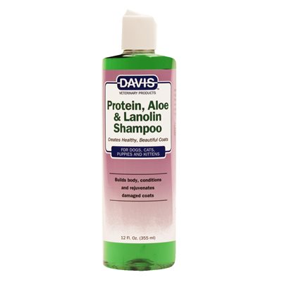 Davis Protein, Aloe & Lanolin Shampoo is a combination of the richest conditioning ingredients available for producing abundantly beautiful coats. Strengthening Protein builds body and revives damaged hair. Lanolin moisturizes, leaving a natural shine, while Aloe soothes itchy or irritated skin. Infused with a delightfully fresh herbal fragrance, this pH balanced formula penetrates deeply, revitalizing hair and skin and creating an unsurpassed shine. May be diluted 10:1.