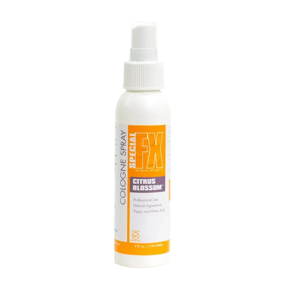 The Special FX line of colognes are alcohol free, eliminates static and smell great. Formulated for Dogs, Cats and Horses. Wheat & Gluten Free, Paraben Free, Non-Toxic and Biodegradable. Ingredients: Natural Proprietary Blend of Essential Oil Fragrance, Aloe, Soy Protein, Vitamin E, and Panthenol.