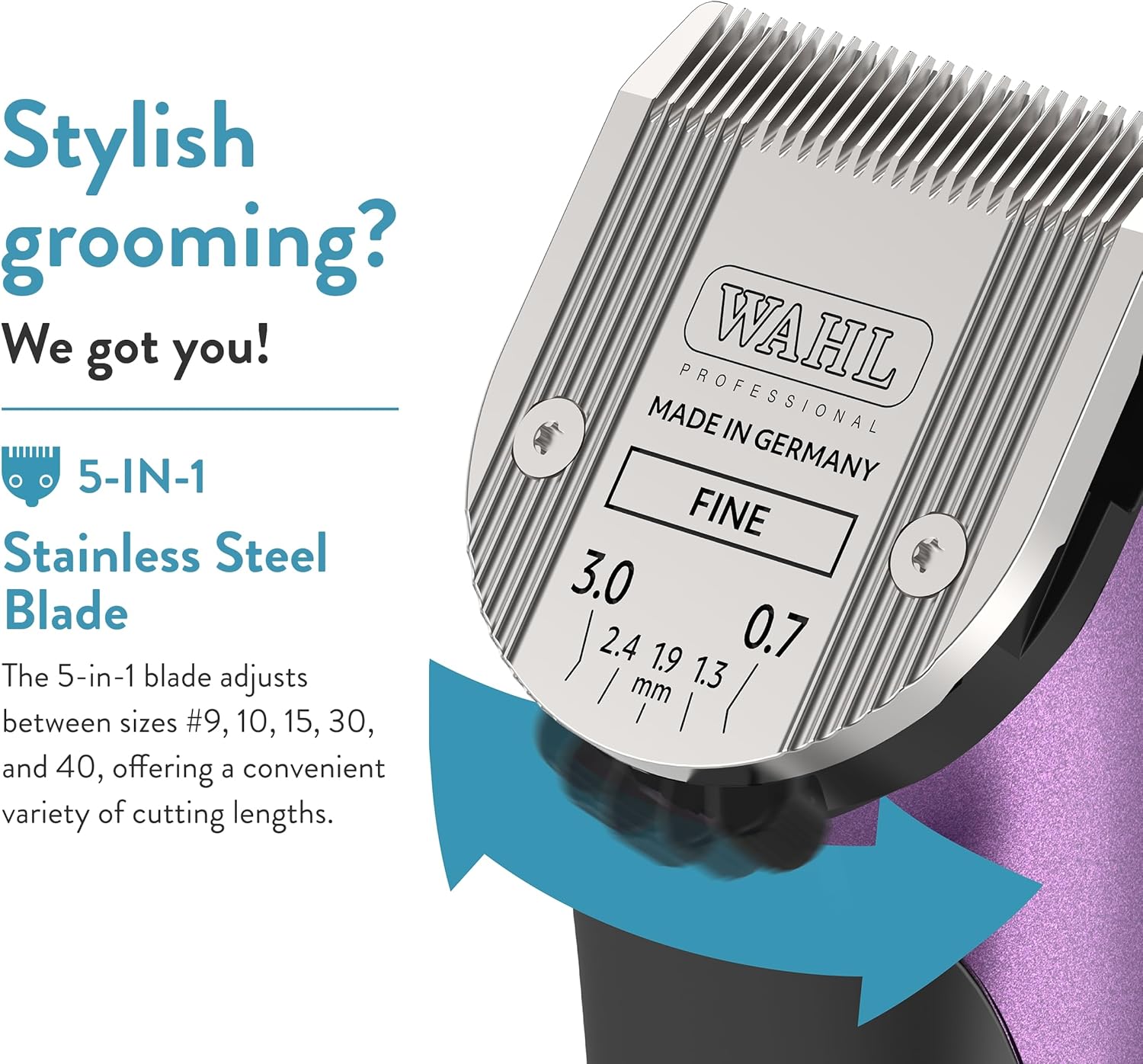 Power up to 5,500 SPM’s with integrated rapid power. ‘5 in 1’ blade technology adjusts blade to sizes #9, #10, #15, #30 & #40. Durable, lightweight, quiet with low vibration and no maintenance. 90 minute cordless runtime with 60 minute full charge time. Blade and clipper are ALWAYS cool running. Higher performance, longer usage times and consistent reliability. Lithium Ion no memory battery prevents overcharging, overheating and only consumes the energy it needs to charge. Includes: Professional Lithium Ion cord/cordless clipper w/ LCD battery level indicator; ‘5 in 1’ Fine blade set with 5 adjustable sizes #9, #10, #15, #30 & #40; charging stand; charger; soft storage case; six attachment guide combs (#1-1/8).